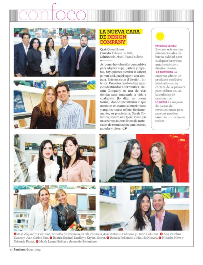 Con la finalidad de mostrar a sus clientes las colecciones de sus líneas de materiales de terminación para techos, paredes y pisos, la tienda Design Company realizó un open house en sus nuevas instalaciones, ubicadas en la calle Jacinto Mañón #25, en el segundo nivel de Plaza Paulette.