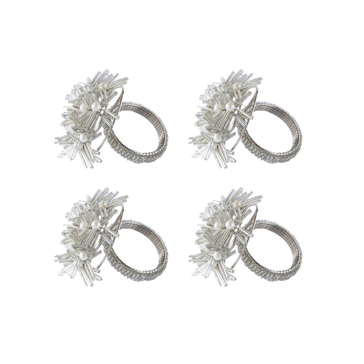 Glass Beaded Metal Floral Napkin Rings Silver Finish Set of 4