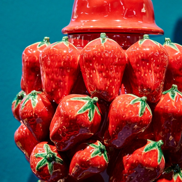 Este jarrón con tapa hecho a mano, por lo que pueden presentarse ligeras variaciones de color que realzan la singularidad de cada uno. Las fresas se moldean individualmente y se fijan al cuerpo del jarrón. Esto crea un impresionante punto de atracción en un intenso color rojo.