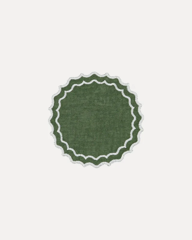 Posavasos de mezcla de lino y algodón, con recorte circular y doble borde ondulado. Un detalle funcional y elegante para proteger las superficies, que además aporta un toque de color y textura a la mesa.