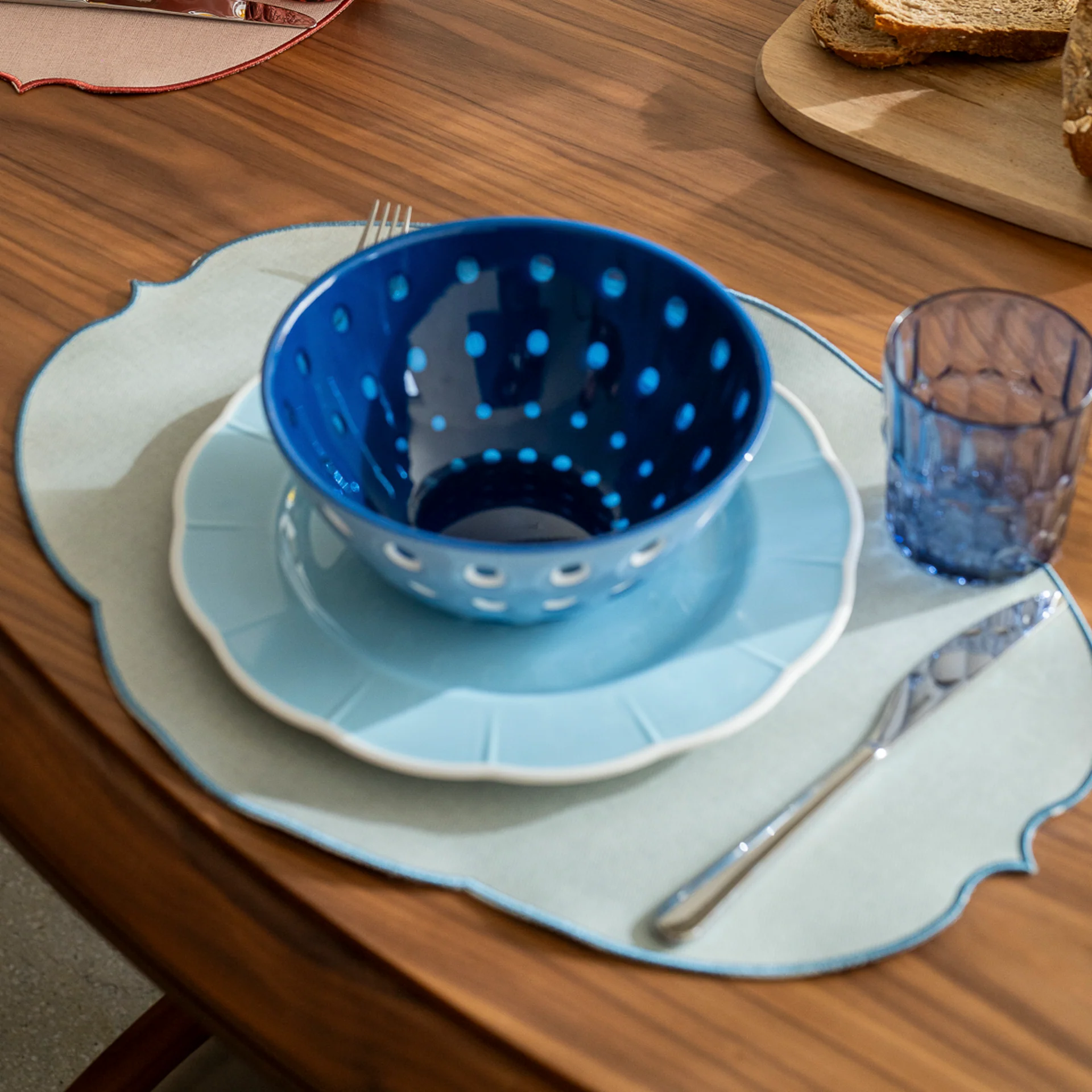 Elegante mantel individual con líneas claras y redondeadas que evocan una flor en plena floración, ideal para una decoración romántica y sofisticada.Doble cara, se enrolla para ahorrar espacio, fácil de limpiar gracias a su material plástico que no absorbe líquidos.