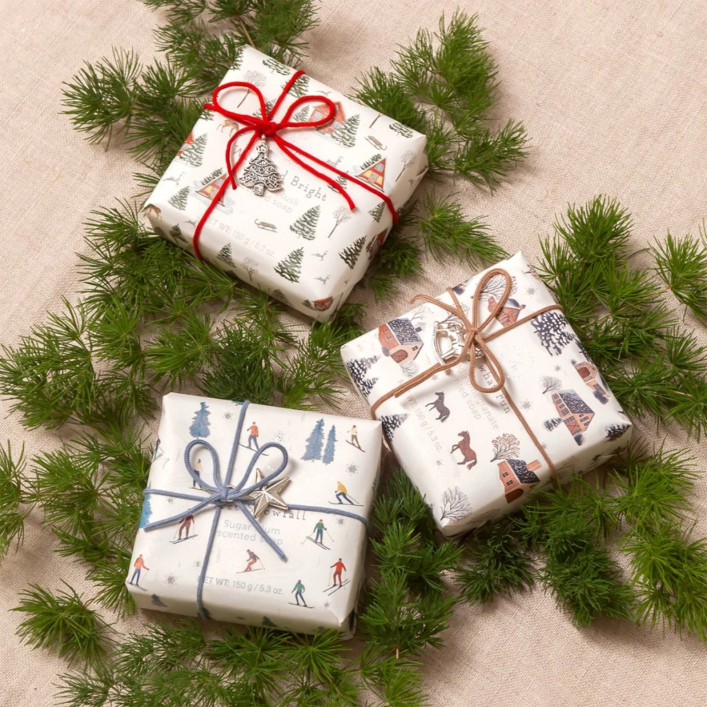 El jabón, envuelto en papel ilustrado con motivos invernales, atado con una cinta y adornado con un adorno plateado, es ideal como pequeño detalle navideño o como un elegante complemento para un set de regalo navideño.