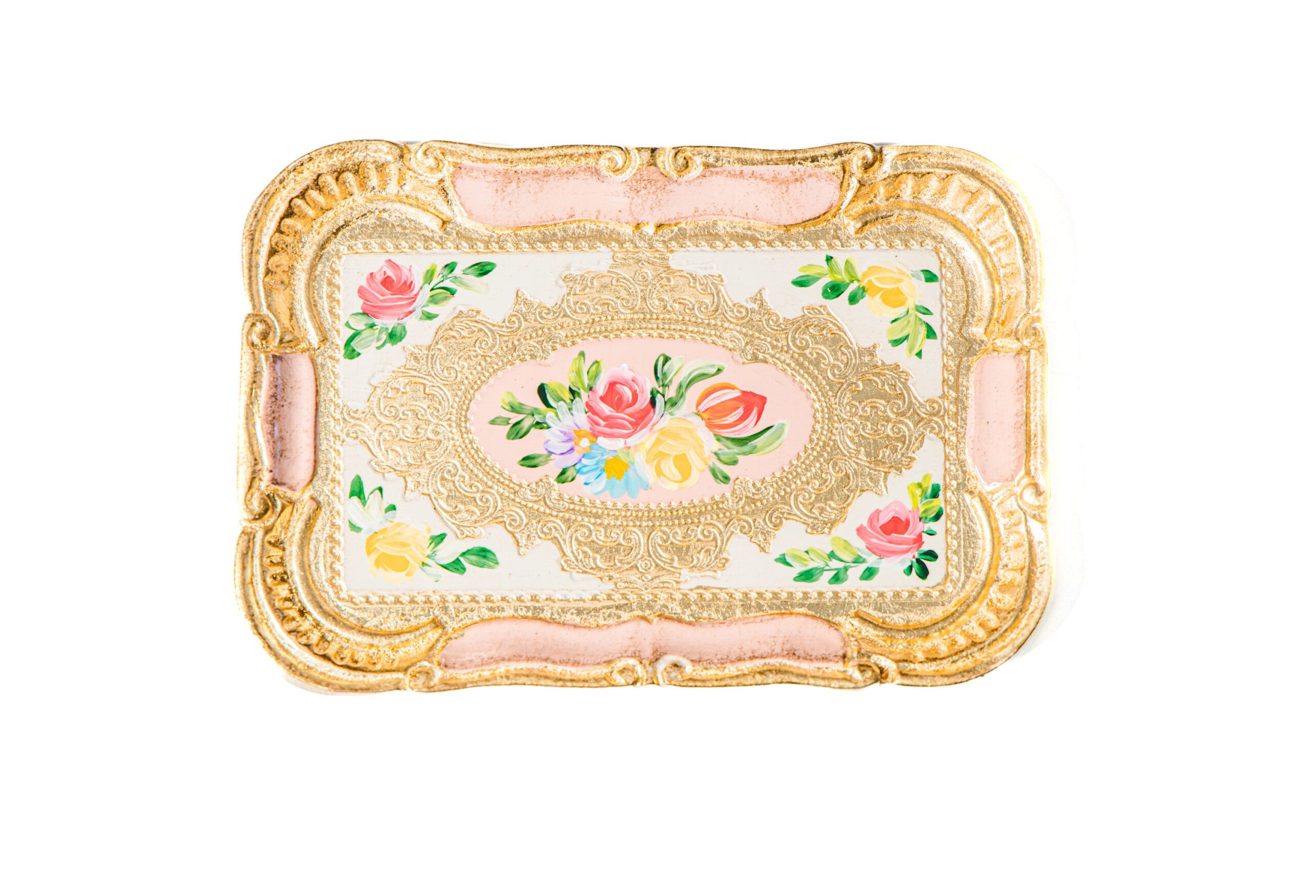 Bandeja florentina de madera y plexiglás, hecha a mano y pintada en Florencia, decorada con pan de oro.